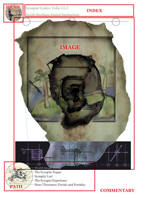 Every Folio from the Codex of the Synapse shares five symbolic elements: the Head (also known as the "Floor"), the Index (or "Room"), the Image (or "Time"), the Path ("Reference Labyrinth"), and the Commentary ("Chain"). A basic understanding of these elements greatly enhances navigation of the Synapse Myth. On the sample Folio below (C6.3), simply click on the appropriate area to access helpful information on each of the Five Elements. Please note that the Commentary, which exists outside of each Folio, independent of the other Four Elements, is displayed here for convenience.